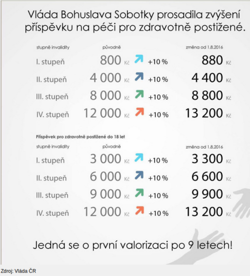 Po téměř deseti letech se zvyšuje příspěvek na péči, jenž dostává více než 300 tisíc lidí se zdravotním postižením, kteří potřebují pomoc druhých. Vláda dnes prosadila ve sněmovně, že se příspěvek zvýší o 10 procent od 1. srpna letošního roku. Senioři a postižení nebudou muset o navýšení žádat, stane se tak automaticky. Podívejte se na konkrétní částky před a po zvýšení u jednotlivých stupňů postižení u dětí i dospělých.
