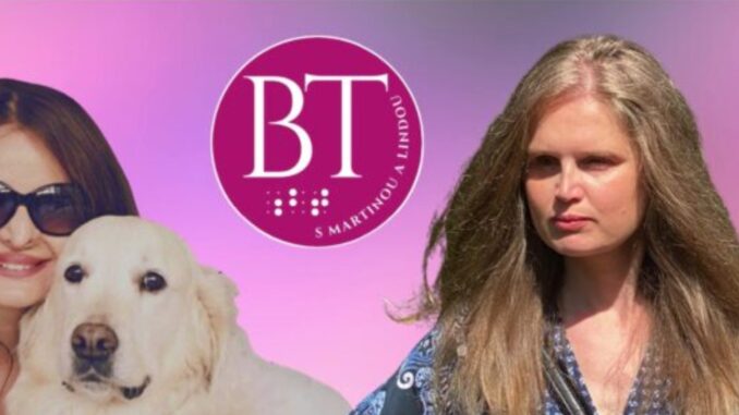 Začali jsme, společně s našimi muži, vymýšlet koncept podcastu. S Martinou jsme věděly, že chceme výhradně audio produkci, aby s tím Honza neměl tolik práce, i když se ukázalo, že i tak je práce dost. Společně jsme vymyslely logo, Honza jej navrhl. Míra, manžel Martiny, jej posléze popsal Martině a společně jsme se shodli na finální podobě. Jedná se o kulatý profil loga, který má fuchsiovou barvu, což je hodně tmavě růžová. Uvnitř kruhu je velkými bílými písmeny napsáno BT (BlindTalk), pod písmeny je to napsáno i Braillovým bodovým písmem (velká písmena BT), a po části obvodu kruhu pak sdělení „s Martinou a Lindou“. Fuchsiovou barvu jsme zvolily, neboť jsme ženy, a líbí se nám výrazné barvy, bílý nápis pak určil Míra, že by mohl připomínat symboliku bílé hole.